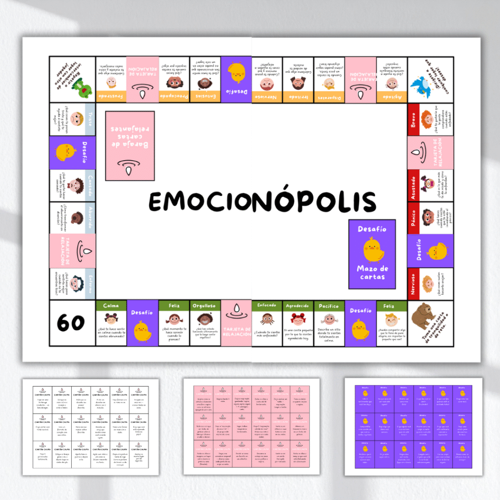 Cada casilla del tablero estimula al niño a pensar, sentir, compartir y aprender nuevas formas de manejar sus emociones — de manera divertida, ligera y segura.